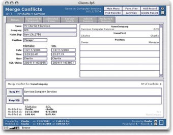 fmSQL Synch lo tiene todo previsto, ya que viene con una utilidad de resolución de conflictos incluida, por si unos campos determinados han sufrido unos cambios divergentes en ambas bases de datos. Es decir que unas entradas que hayan sido modificadas en ambas bases de datos desde la última sincronización implican unos posibles conflictos de sincronización. Por lo que fmSQL Synch genera un log con ambas modificaciones, log que podremos consultar para decidir cuales son los cambios que vamos a conservar y cuales vamos a excluir de la sincronización.